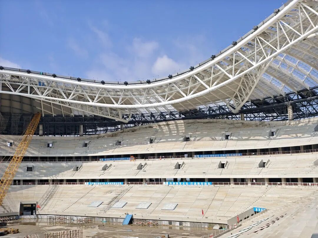 后續(xù)工程穩(wěn)步推進 膜結(jié)構(gòu)施工將啟。目前,項目屋蓋鋼結(jié)構(gòu)已全部施工完成,屋面與幕墻結(jié)構(gòu)正同步推進,建筑輪廓如同 “黃河明珠” 般在黃河之畔熠熠生輝。下一步,施工團隊將在看臺上安裝人體工學(xué)觀賽座椅,進一步優(yōu)化觀賽舒適度。